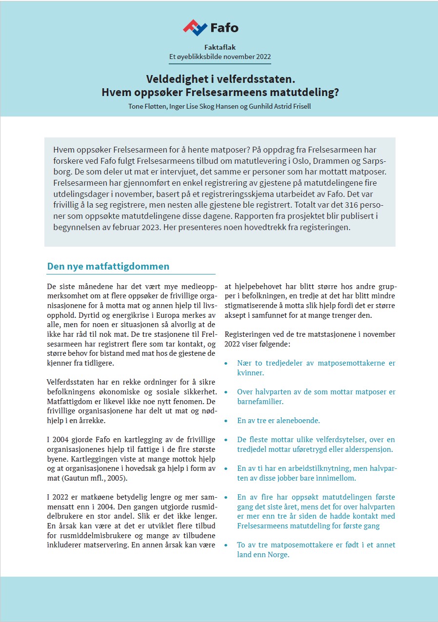 Hvem oppsøker Frelsesarmeen for å hente matposer? På oppdrag fra Frelsesarmeen har forskere ved Fafo fulgt Frelsesarmeens tilbud om matutlevering i Oslo, Drammen og Sarpsborg. De som deler ut mat er intervjuet, det samme er personer som har mottatt matposer. Frelsesarmeen har gjennomført en enkel registrering av gjestene på matutdelingene fire utdelingsdager i november, basert på et registreringsskjema utarbeidet av Fafo. Det var frivillig å la seg registrere, men nesten alle gjestene ble registrert. Totalt var det 316 personer som oppsøkte matutdelingene disse dagene. Rapporten fra prosjektet blir publisert i begynnelsen av februar 2023. Her presenteres noen hovedtrekk fra registeringen.