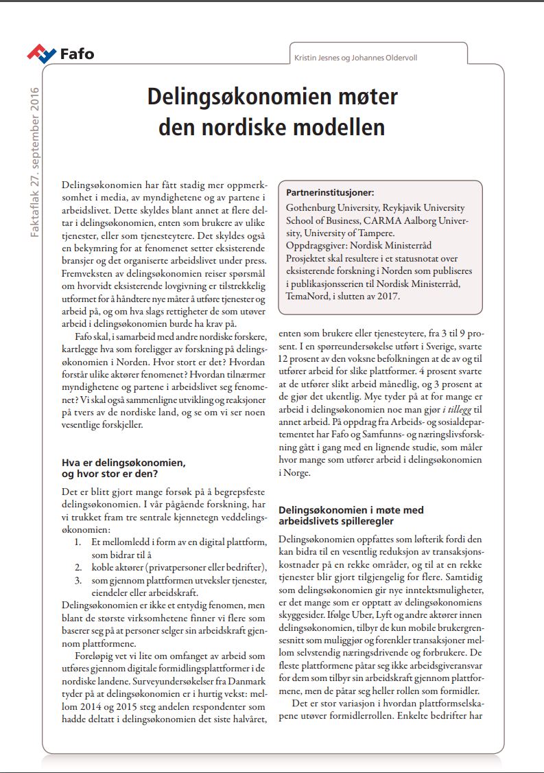 Fafo skal, i samarbeid med andre nordiske forskere, kartlegge hva som foreligger av forskning på delingsøkonomien i Norden. Hvor stort er det? Hvordan forstår ulike aktører fenomenet? Hvordan tilnærmer myndighetene og partene i arbeidslivet seg fenomenet? Vi skal også sammenligne utvikling og reaksjoner på tvers av de nordiske land, og se om vi ser noen vesentlige forskjeller.