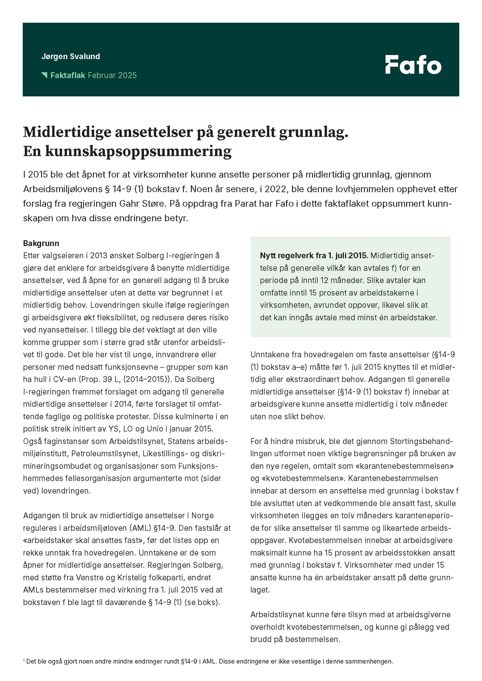 I 2015 ble det åpnet for at virksomheter kunne ansette personer på midlertidig grunnlag, gjennom Arbeidsmiljølovens § 14-9 (1) bokstav f. Noen år senere, i 2022, ble denne lovhjemmelen opphevet etter forslag fra regjeringen Gahr Støre. På oppdrag fra Parat har Fafo i dette faktaflaket oppsummert kunnskapen om hva disse endringene betyr.
