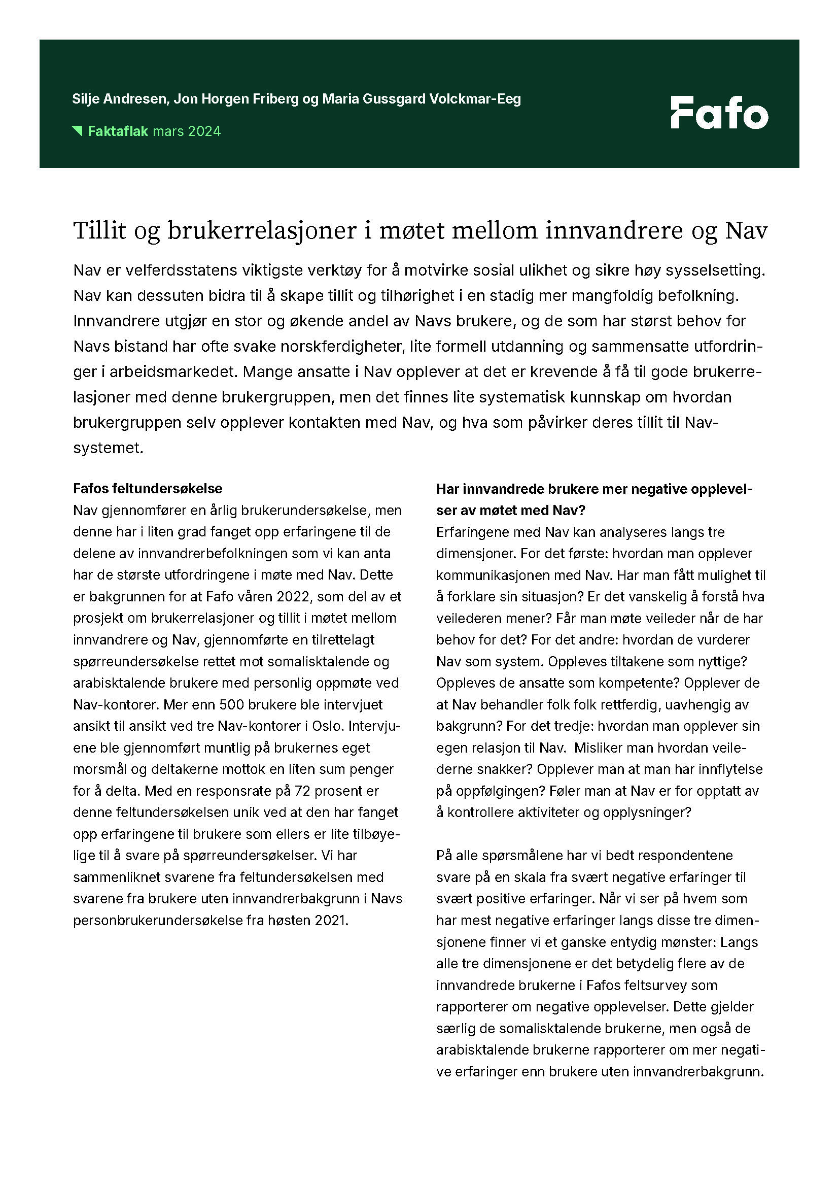 Innvandrere utgjør en stor og økende andel av Navs brukere, og de som har størst behov for Navs bistand har ofte svake norskferdigheter, lite formell utdanning og sammensatte utfordringer i arbeidsmarkedet. Mange ansatte i Nav opplever at det er krevende å få til gode brukerrelasjoner med denne brukergruppen, men det finnes lite systematisk kunnskap om hvordan brukergruppen selv opplever kontakten med Nav, og hva som påvirker deres tillit til Navsystemet.