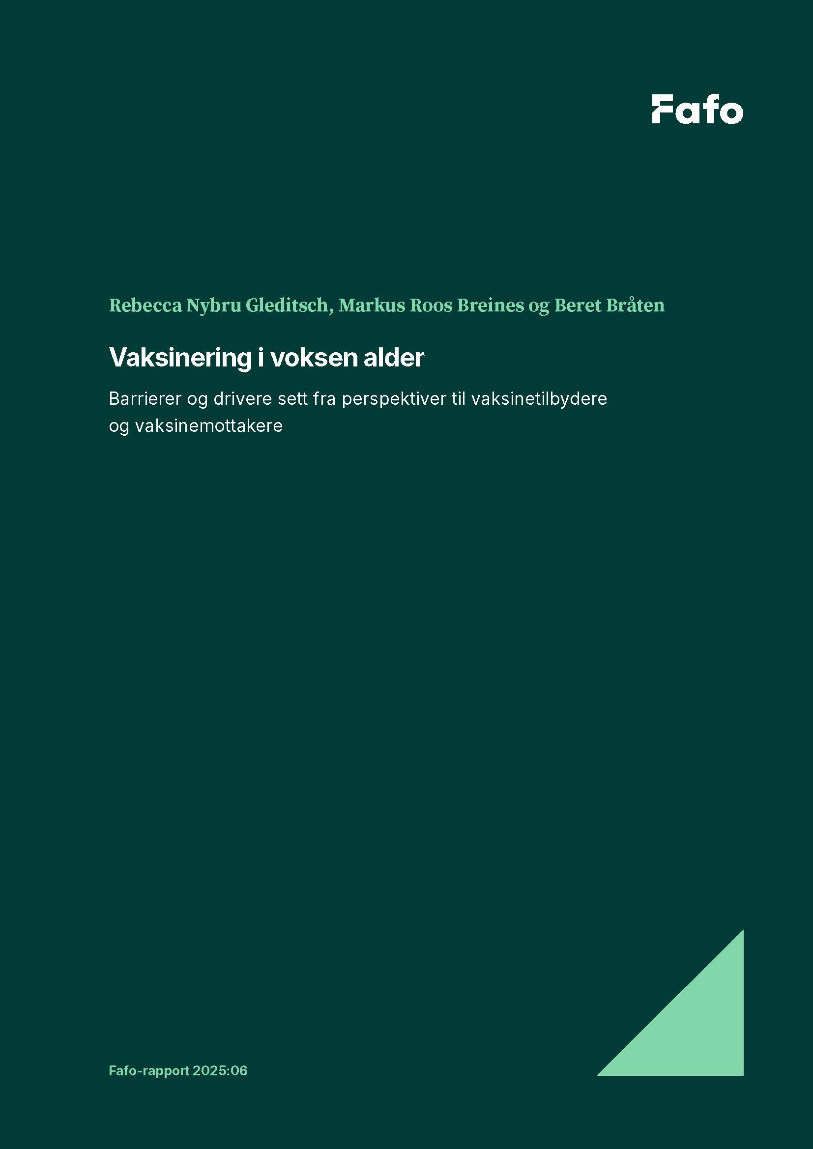 I denne rapporten presenterer vi funn fra et forskningsprosjekt der tema er vaksinering i voksen alder. Prosjektet har hatt oppmerksomheten rettet mot to målgrupper: gravide og de som er 65 år og eldre. Ambisjonen var å identifisere hva som hemmer og hva som fremmer anbefalt vaksinering i disse målgruppene. Antakelsen var at flere faktorer kunne påvirke dette: Organisering av vaksinearbeidet i kommunene, de som setter vaksiner sine holdninger og praksiser – og holdninger og praksiser blant individer i de to målgruppene. Derfor har vi gjennom individuelle intervjuer og gruppeintervjuer undersøkt hvordan kommuner organiserer arbeidet, helsepersonells holdninger og praksiser i møte med brukere og i forhold til egen vaksinering, og i tillegg hvordan gravide / kvinner som nylig har født og personer over 65 år vurderer vaksinering. Datainnsamlingen er gjort i sju kommuner/bydeler, og de er valgt basert på beliggenhet, antall innbyggere og vaksinasjonsdekning.