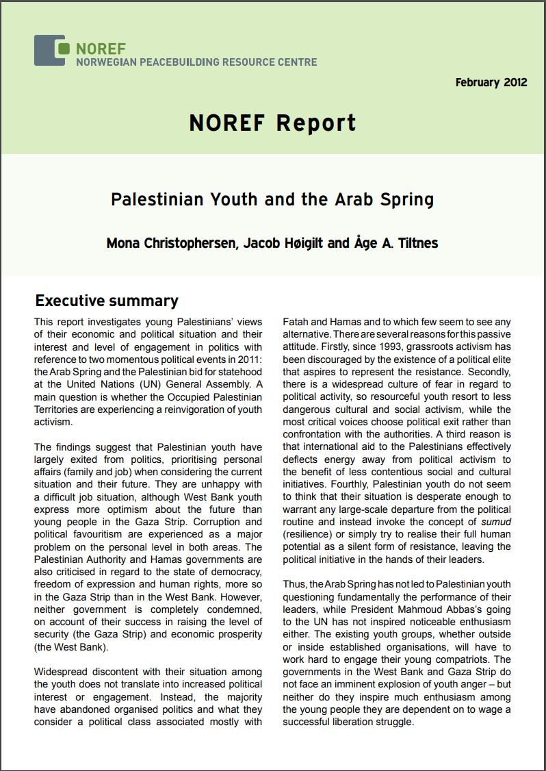 This report investigates young Palestinians’ views of their economic and political situation and their interest and level of engagement in politics with reference to two momentous political events in 2011: the Arab Spring and the Palestinian bid for statehood at the United Nations (UN) General Assembly. A main question is whether the Occupied Palestinian Territories are experiencing a reinvigoration of youth activism.