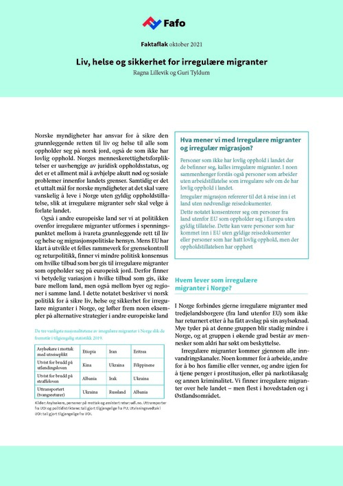 Norske myndigheter har ansvar for å sikre den grunnleggende retten til liv og helse til alle som oppholder seg på norsk jord, også de som ikke har lovlig opphold. Norges menneskerettighetsforpliktelser er uavhengige av juridisk oppholdsstatus, og det er et allment mål å avhjelpe akutt nød og sosiale problemer innenfor landets grenser. Samtidig er det et uttalt mål for norske myndigheter at det skal være vanskelig å leve i Norge uten gyldig oppholdstillatelse, slik at irregulære migranter selv skal velge å forlate landet.