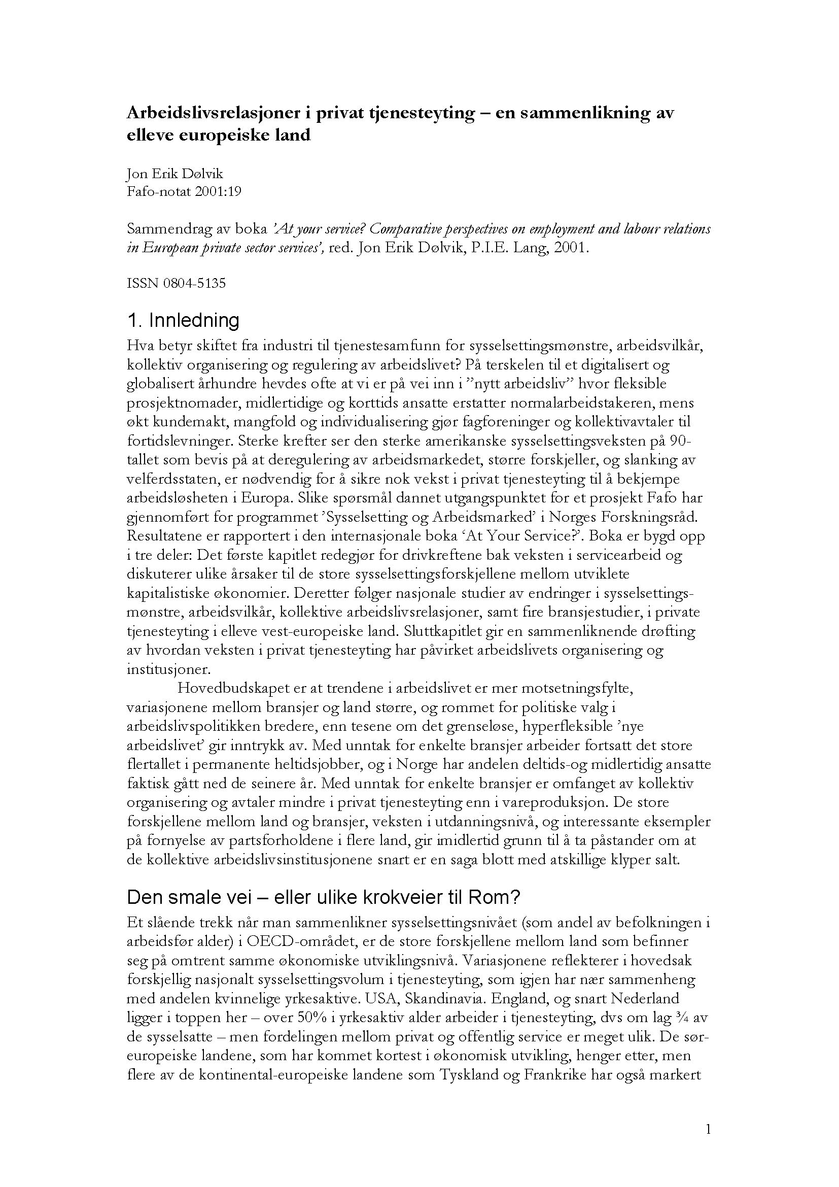 Notatet er et Sammendrag av boka ’At your service? Comparative perspectives on employment and labour relations in European private sector services’, red. Jon Erik Dølvik, P.I.E. Lang, 2001.