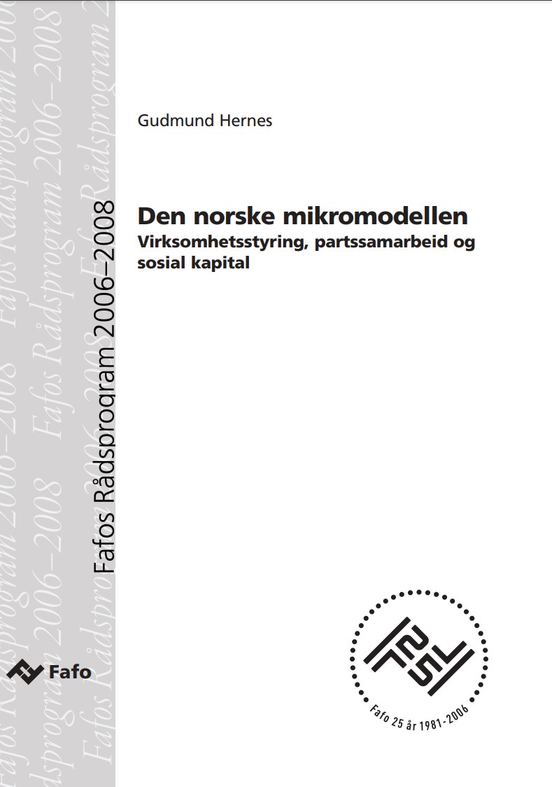 På den ene siden består den norske mikromodellen av forhandlinger om lønn, regelverk og medbestemmelse, på den annen side av praktisk og vedvarende samarbeid for videreutvikling av bedriften. Den første komponenten – fordeling av inntjening – er viktig. Men isolert betraktet betyr det at eiere og ansatte så å si forsøker å få mest mulig ut som sin del av det bedriften til enhver tid fremstiller. Den andre komponenten – samarbeid om utvikling – er, og blir kanskje stadig mer, kritisk. Denne andre komponenten er langt på vei en nordisk frontdisiplin. Partssamarbeidet om utviklingen av virksomhetene kan spenne fra rent formelle konsultasjoner, til mer uformelle kontakter, er gjerne konkret og hyppig, mest når tillitsvalgte tar del i prosjekter, endring av rutiner og innføring av innovasjoner. Tesen i denne rapporten er at utviklingen av virksomhetenes sosiale kapital er det kritiske element i den norske mikromodellen.