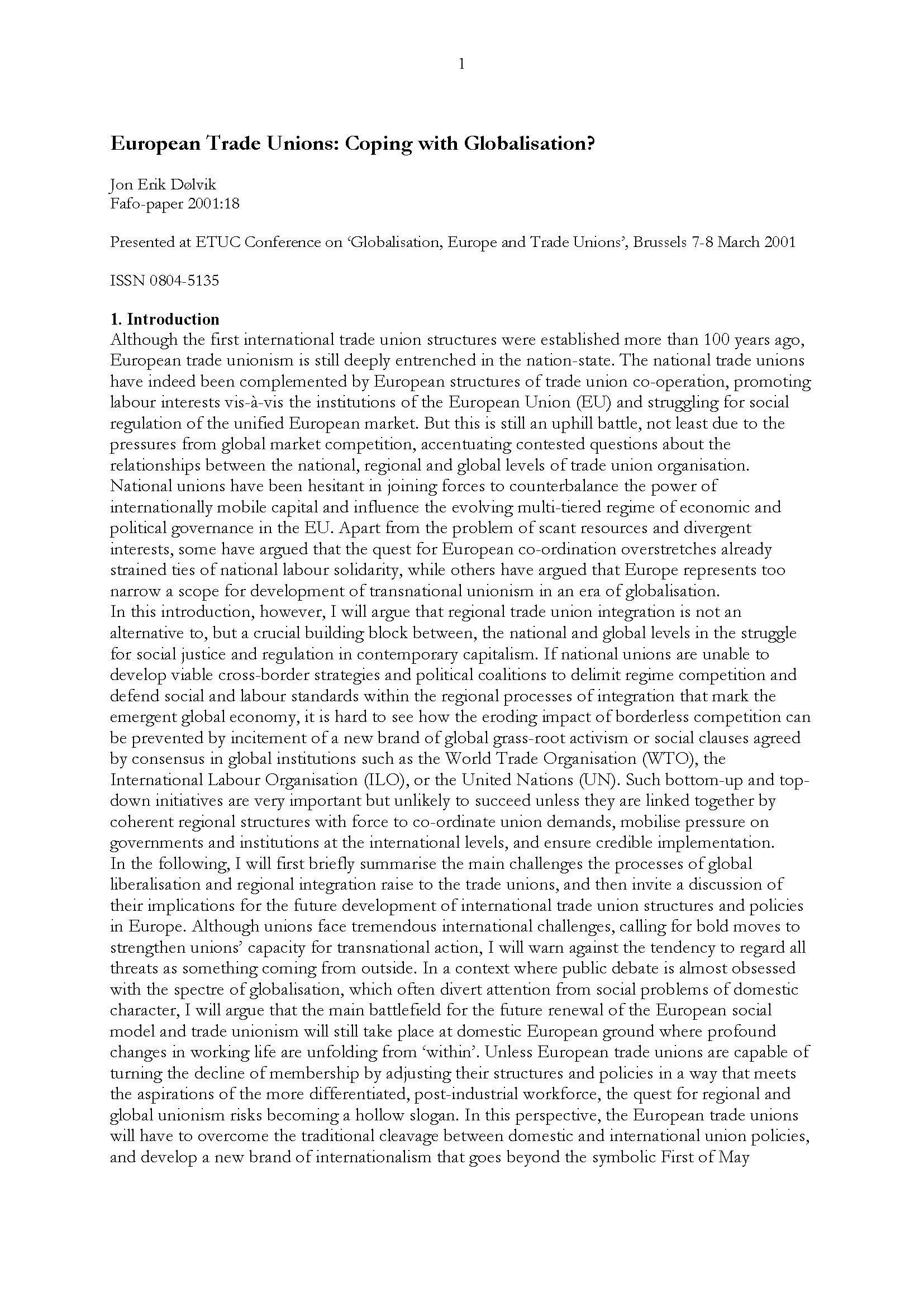 This paper was presented by Jon Erik Dølvik at ETUC Conference on ‘Globalisation, Europe and Trade Unions’, Brussels 7-8 March 2001.
