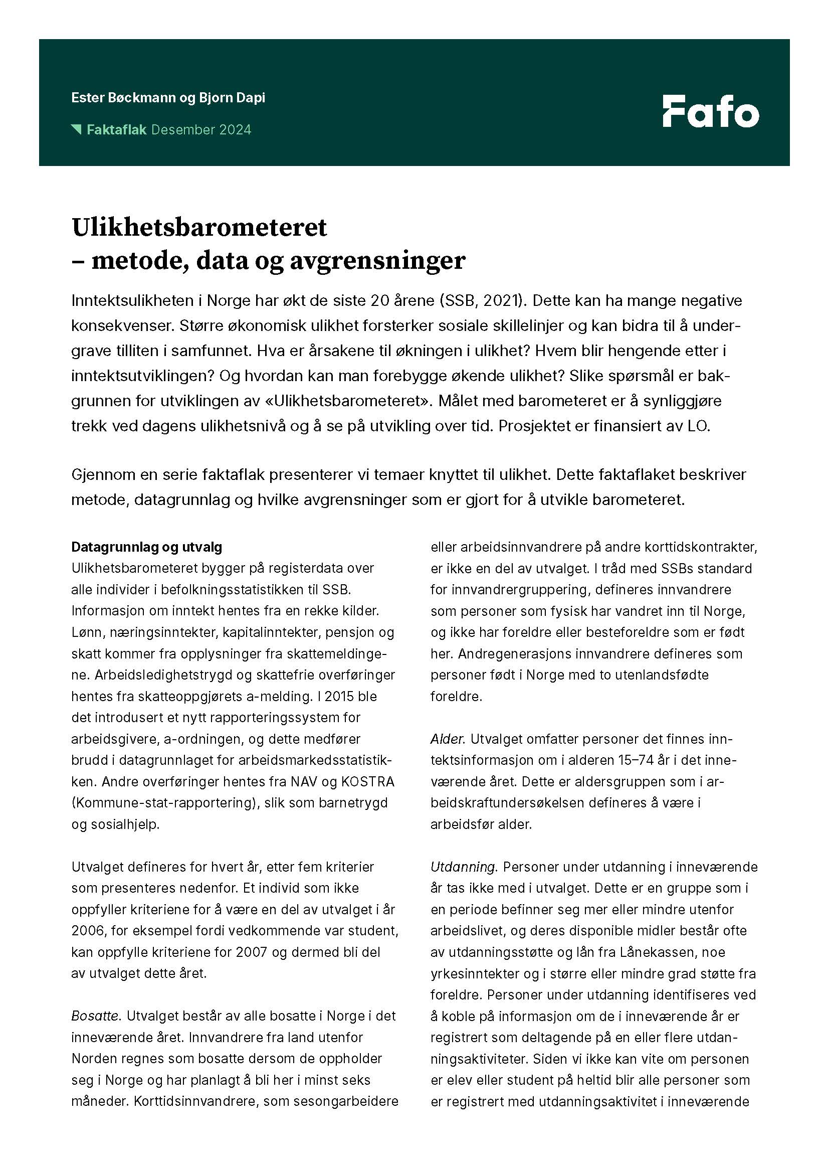 Hva er årsakene til økningen i ulikhet? Hvem blir hengende etter i inntektsutviklingen? Og hvordan kan man forebygge økende ulikhet? Slike spørsmål er bakgrunnen for utviklingen av «Ulikhetsbarometeret». Målet med barometeret er å synliggjøre trekk ved dagens ulikhetsnivå og å se på utvikling over tid. Prosjektet er finansiert av LO.
