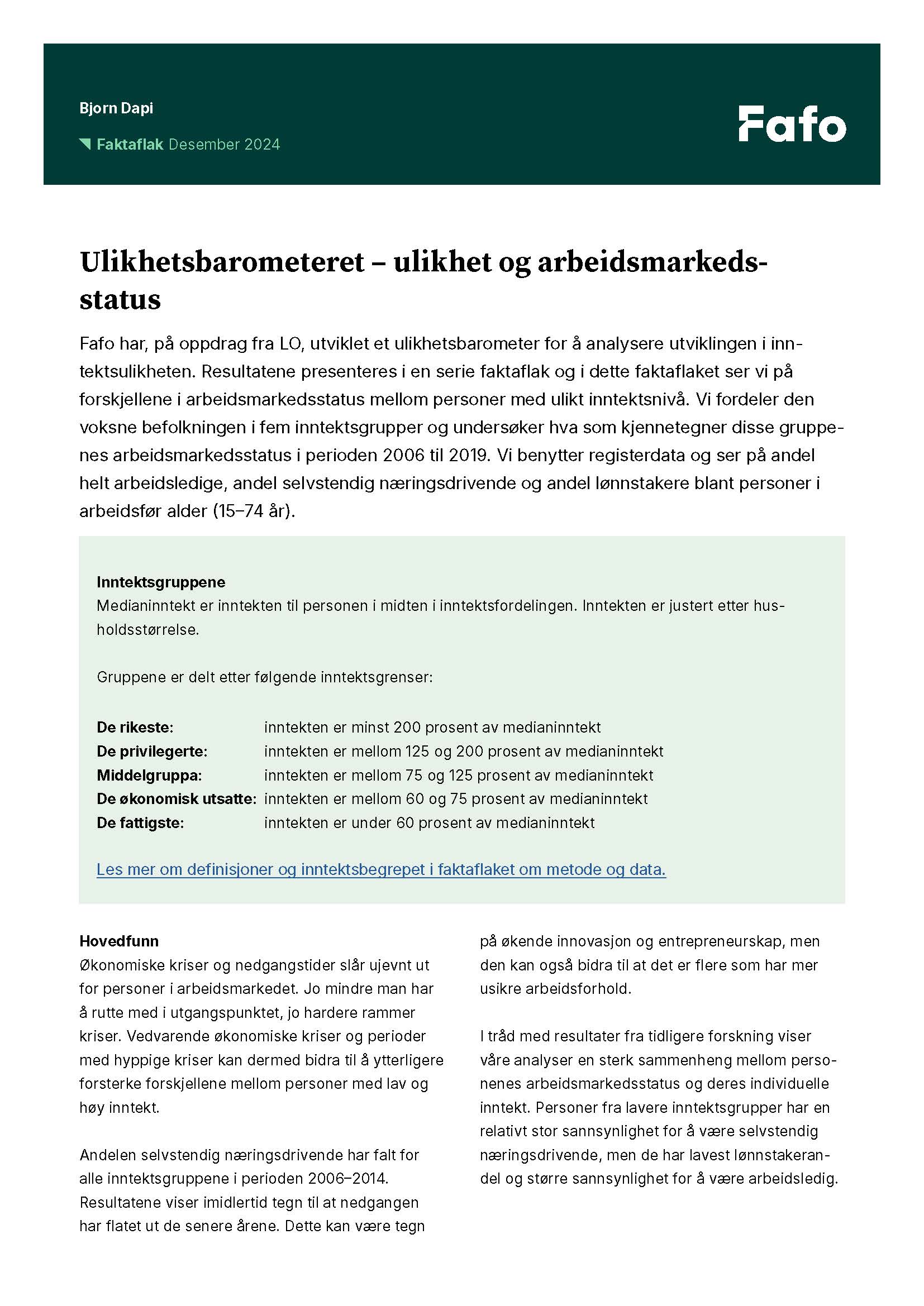 Fafo har, på oppdrag fra LO, utviklet et ulikhetsbarometer for å analysere utviklingen i inntektsulikheten. Resultatene presenteres i en serie faktaflak og i dette faktaflaket ser vi på forskjellene i arbeidsmarkedsstatus mellom personer med ulikt inntektsnivå.