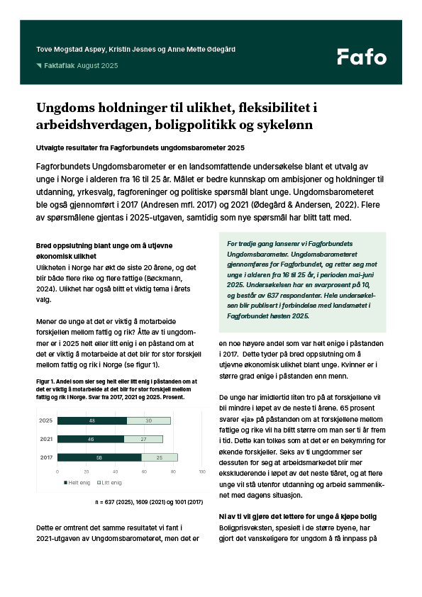 Fagforbundets Ungdomsbarometer er en landsomfattende undersøkelse blant et utvalg av unge i Norge i alderen fra 16 til 25 år. Målet er bedre kunnskap om ambisjoner og holdninger til utdanning, yrkesvalg, fagforeninger og politiske spørsmål blant unge. Ungdomsbarometeret ble også gjennomført i 2017 og 2021. Flere av spørsmålene gjentas i 2025-utgaven, samtidig som nye spørsmål har blitt tatt med.
