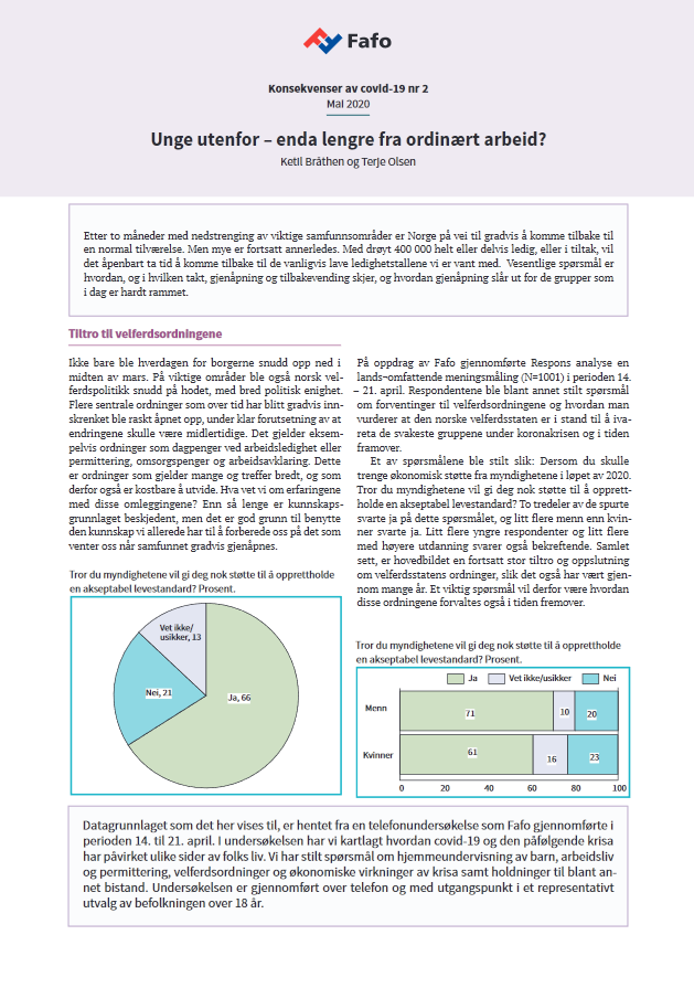 Fafo har kartlagt hvordan covid-19 og den påfølgende krisa har påvirket ulike sider av folks liv. Vi har stilt spørsmål om hjemmekontor, hjemmeundervisning av barn, arbeidsliv og permittering, velferdsordninger og økonomiske virkninger av krisa og holdninger til blant annet bistand.